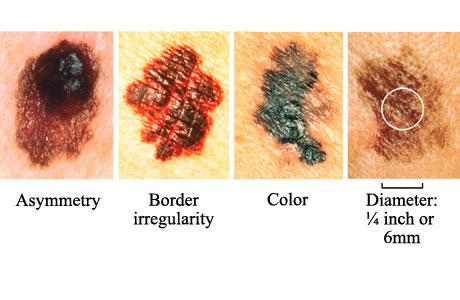 AsymmetryBorder irregularityColor change or variation in colorDiameter (increase in size, or larger than a pencil eraser)  Source: NCI Visuals Online. Skin Cancer Foundation.